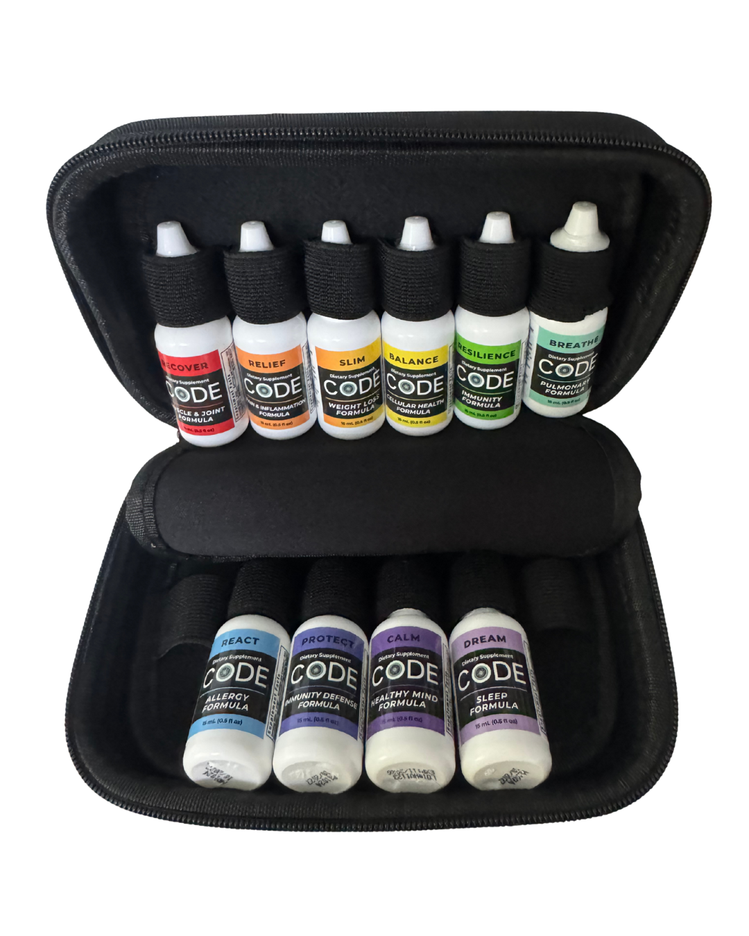 This is the full collection of CODE Health Products. Ten – 15mL Bottles including one of each purpose oriented formulation. Plus our Branded Carrying Case.